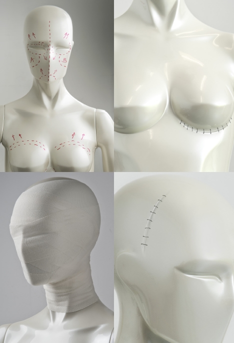 After I found out where to take my definitive photos I continued to on making tests to choose then the series that would make my show. The idea that I had was to work both on the perception of himself and on the traces of cosmetic surgery and on the act of Aesthetic surgery but portatoall exaggeration. This allowed me to oscillate between a reality in which the dummy is human and one in which the human is a dummy with all possible sfaccettatureintermedie. The Spectator so, looking at these pictures, repressesed his ego and projects me in the subject of my story that is the extremeization of the representation of the woman simply as an object. This is what the art history has always happened, the woman was neither the artist nor the spectator but only what was looked at and this, of course, transformed her into something non-human subordinate to what the artist wanted and what the spectator transposed. My project also plays on this: The Soggettodel my tale is in a space halfway between the complete commodification of the body that depends on the choice to completely eliminate the people in favor of an abstraction of the body, and the Restore "human life" to a oggettoinanimato. The dummy is human in gestural and thought but at the same time is not a living thing, this is noted in the photos in the relationship between body and face: The body is completely humanized and contrasts with a face that is lacking in any expressiveness, in this way the photos recall the perfection of the idealized and artificial body without detaching from a human imaginary. The same ambivalence is also in the role of the mannequin towards those who look at the actions shown by the dummy are usually something that should not be shown but at the same time the subject, being a dummy, it is very far from voyeurism as it is an object that is born with the specific role of Exhibitor. Also through this split of the role of the mannequin towards those who watch it strengthens the twofold meaning of the subject whose nature is always less defined and it depends more and more on how much the viewer can identify itself within the history. The mannequin will be as human as those who watch recognize as his actions shown (mainly at the beginning of the story) and, after becoming that dummy, the spectator gradually becomes an object that has behaviors typical of that oggettoallontanandosi from what is really human.