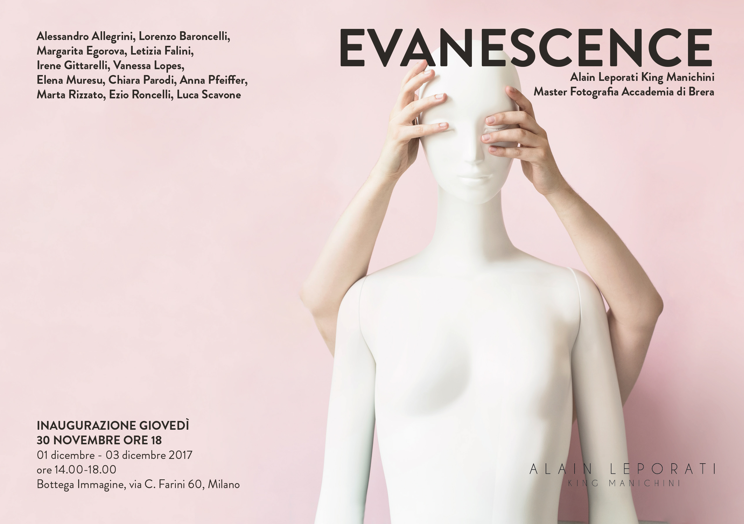 Alain Leporati King Manichini supports and awards Brera Academy students from the graduate degree program of photography, an extraordinary collaboration which will present the works of the 12 best artists from 30 November to 3 December 2017 at the Bottega Immagine (Via Carlo Farini, 60 – Milan, Italy).